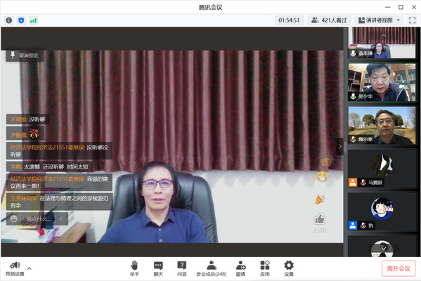 参会学生在腾讯会议聊天中与主讲人、与谈人积极互动、收获颇丰,纷纷表示通过此次讲座的学习,对法律联结问题有了更加清晰的理解,同时也对法经济学研究方法的应用有了更加深刻的认识。(刘欣鑫、储沁 撰稿、摄影)