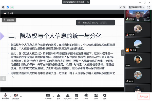 4月16日晚,科研处、法律学院主办的“名家讲坛”第一百零二讲在线举办,中国人民大学法学院教授石佳友受邀以“隐私权与个人信息关系的再思考”为主题开展学术讲座。本次讲座由副校长郑少华教授担任致辞人,上海财经大学法学院教授朱晓喆、华东政法大学教授满洪杰担任与谈人,王康教授担任主持人,吸引了师生二百余人参与。