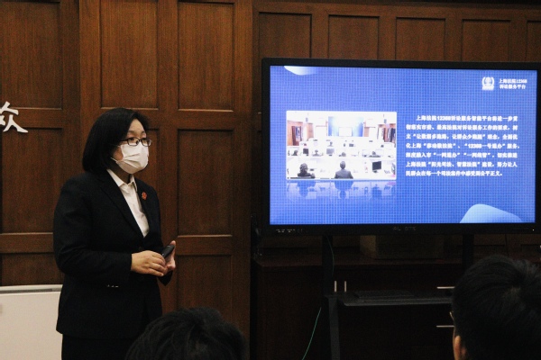 同学们了解到,作为上海法院诉讼服务三大名片之一的“12368智能服务平台”是全国法院第一个诉讼服务智能平台,包含联系法官,诉讼咨询、案件查询等重点功能。自2014年创立以来,12368平台提供各类诉讼服务达3389万余次。目前,日均接听电话2200多次,月均网上立案达8万余件,切实推进了上海法院“阳光司法、智慧法院”建设,让更多人民群众在司法案件中感受到了公平正义。