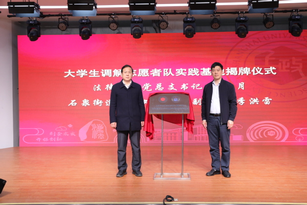 法律学院党总支书记文立月、石泉路街道办事处党工委副书记季洪雷为石泉路街道大学生调解志愿者队实践基地揭牌。