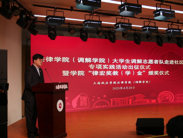 4月25日,法律学院(调解学院)做新时代“枫桥经验”践行者——大学生调解志愿者队走进社区专项实践活动出征仪式暨学院“律宏奖教(学)金”颁奖仪式在校学生活动中心报告厅隆重举行。校党委副书记、主题教育领导小组副组长刘刚,校学生工作部部长丁永建、合作发展处处长王晓宇,法律学院党总支书记文立月、调解学院院长侯怀霞,石泉路街道办事处主任吕升昂、党工委副书记季洪雷,上海律宏(湛江)律师事务所主任黄冬艳等领导、法律学院师生代表参加活动。