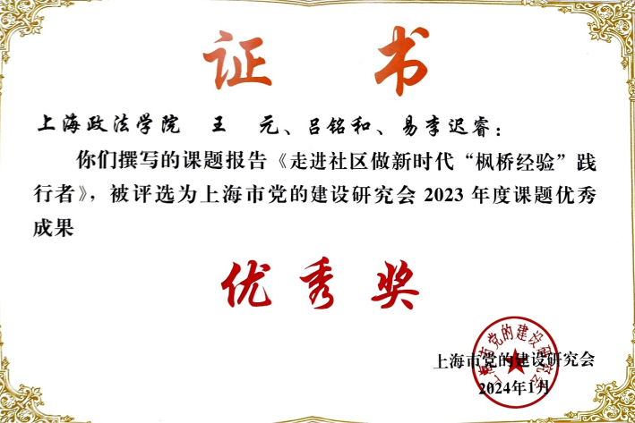 2023年,上海市党的建设研究会根据全国党建研究会课题目录,市党建办和市委组织部的工作要求,发布了89个参考课题(15个重点课题、74个自选课题),各会员单位、专委会、党建研究基地和特邀研究员申报了990个参评课题,认真开展研究,形成了一批成果。上政第7学生党支部申报的党建课题《走进社区做新时代“枫桥经验”践行者》荣获2023年度上海市党建研究会课题优秀成果“优秀奖”。