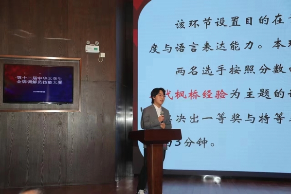 “第一现场”环节的调解案例陈述则考察专业知识应用程度、应变能力、语言表达能力等。本环节共有五个调解案例,每位选手随机选择一个案例陈述调解方案,几位选手在短时间内抓住矛盾核心,运用换位思考调解法、背对背调解法等方式呈现出色的分析能力和解决思路,各案例中方案陈述及问答效果最佳的两位选手晋级第三环节。