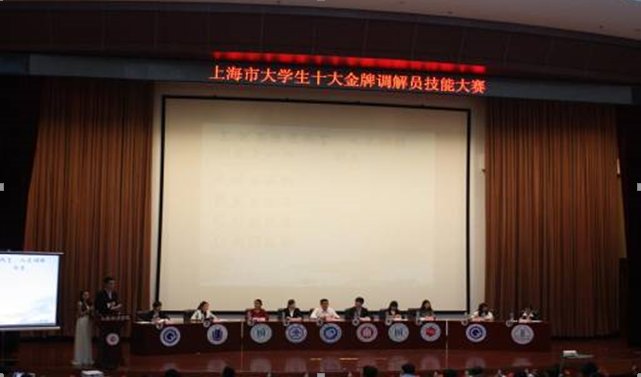 2014年10月23日晚18:00,上海市大学生十大金牌调解员技能大赛在天马讲堂举行。应邀参加本次大赛的评委和嘉宾有江苏南京司法局基层处处长张少华、福建南平医调委主任龚选民、山西省医调委主任韩学军、吉林长春医调委主任初显力、上海工会管理职业学院副教授王彩萍、新利18官方客服法律学院党总支书记沈国勤以及来自上海大学、上海师范大学、上海交通大学、上海工会管理职业学院、华东理工大学、华东师范大学、华东政法大学、新利18官方客服的参赛选手及老师。