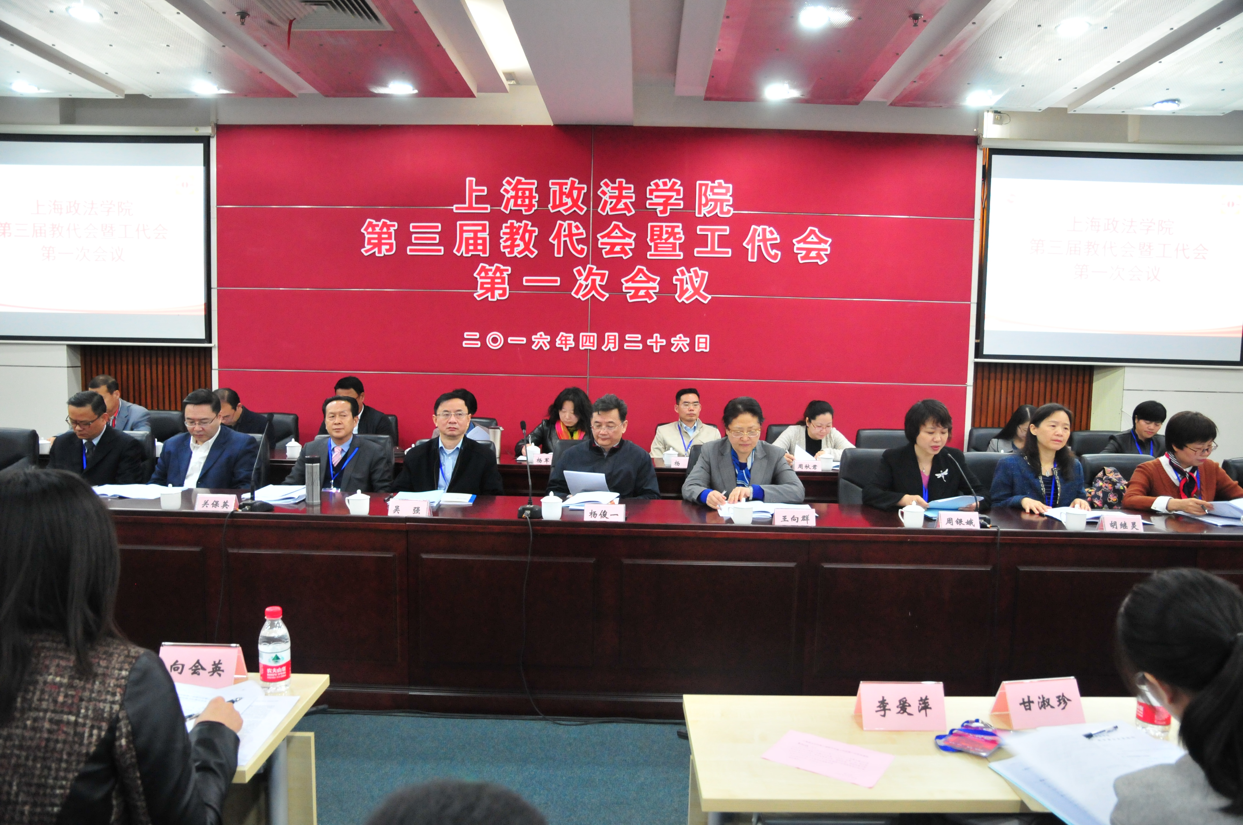4月26日,新利18官方客服第三届教代会暨工代会第一次会议在庸夫楼101会议室召开,上海市教卫工作党委副巡视员、上海市教育工会常务副主席王向群出席会议并讲话,校党委书记杨俊一、校党委副书记、纪委书记吴强、校党委副书记、副校长、工会主席周银娥、副校长关保英、胡继灵、潘牧天出席会议。全体教职工代表及来自学校各职能部门的有关负责人参加了会议。