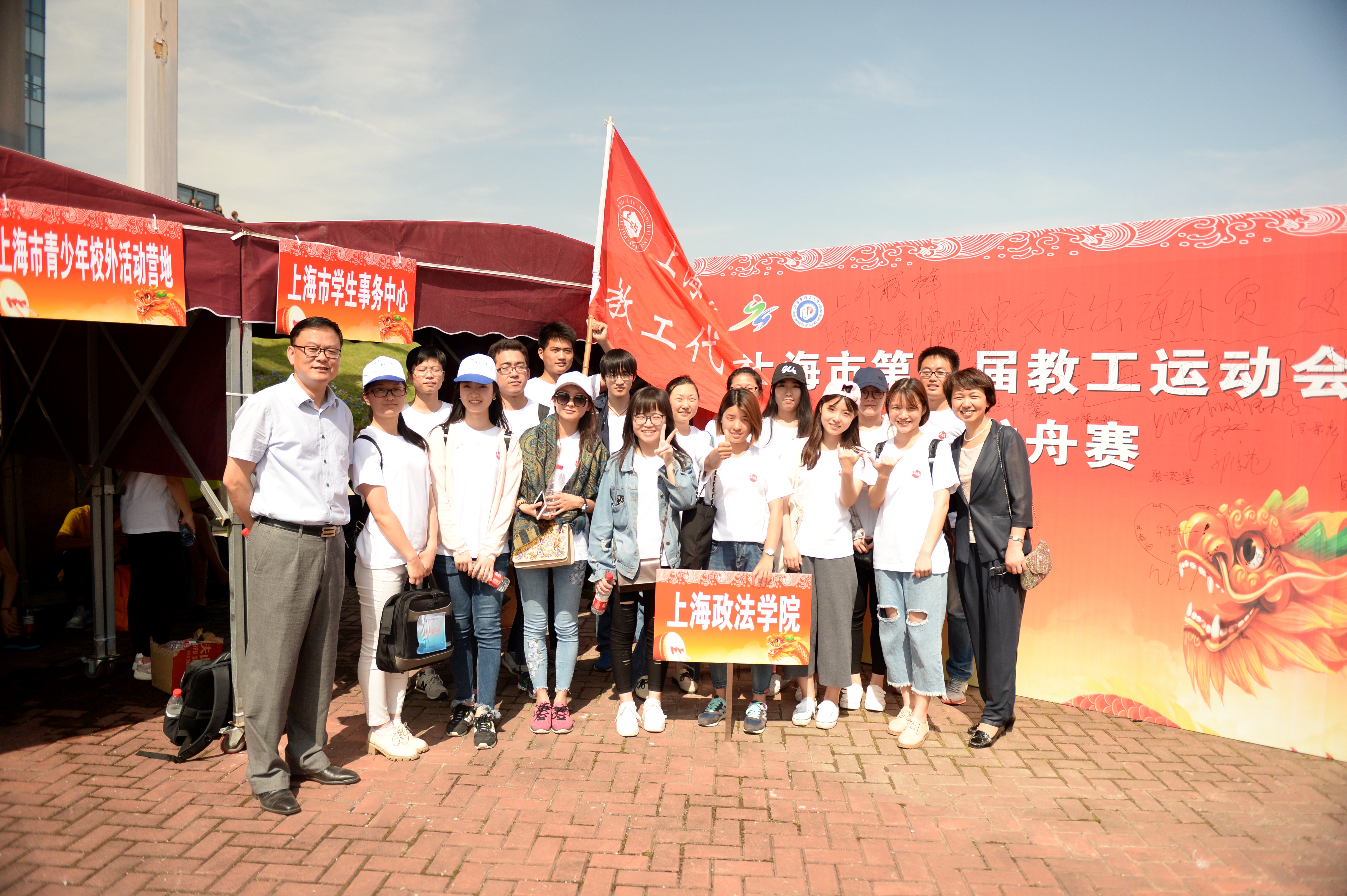 我校代表团由参赛老师和学生拉拉队员构成。我校龙舟赛代表队都是自愿报名参与此次比赛的,为了这次比赛,老师们辛苦训练,工会也曾组织参赛队员们在青浦龙舟训练基地进行训练。烈日当空,但参赛队员们仍然热情高涨。