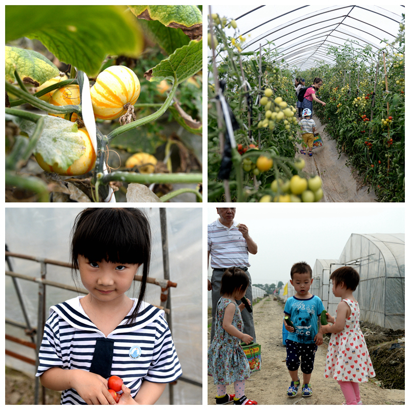 上午孩子们一路欢歌笑语乘坐巴士来到采摘园,在农民伯伯的指导下,每个小朋友领了一个篮子,欢快的奔走在各种蔬菜大棚间,自己动手采摘小南瓜、小番茄、小黄瓜等果蔬。尽管大棚里温度较高,但家长和孩子们的热情高涨,每组家庭都采摘了满满一筐果蔬,抱着自己的劳动成果,纷纷要求合影留念。