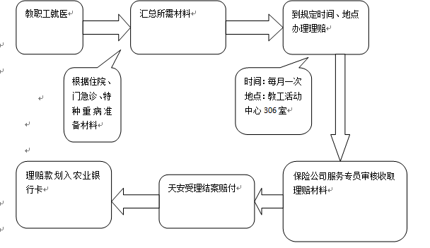 由天安保险公司派专人每月一次来校理赔,时间安排一般为每月第二周的周二上午9:00-下午16:00(具体通知见工会网站)。