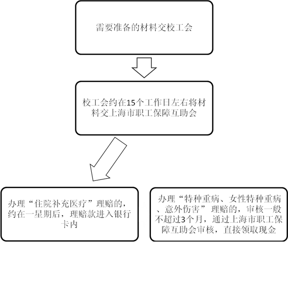 被保障人把上述需要准备的材料交校工会办公室,校工会约在15个工作日左右将材料交上海市职工保障互助会办理理赔。对于办理“住院补充医疗”理赔的,一般当日审核完毕,约在一星期后,理赔款进入银行卡内,对于办理“特种重病、女性特种重病” 理赔的,审核一般不超过3个月,通过上海市职工保障互助会审核,直接领取现金。