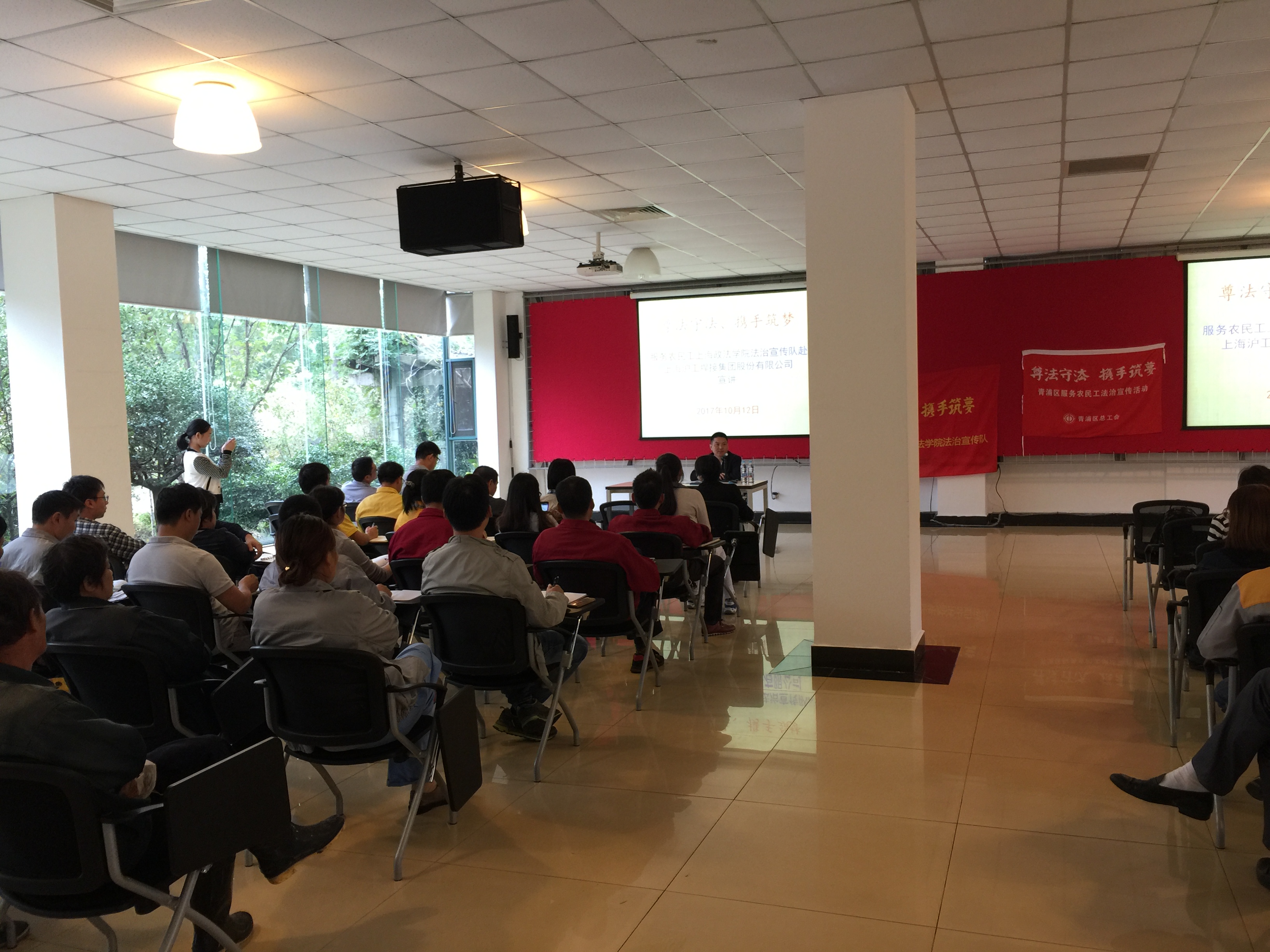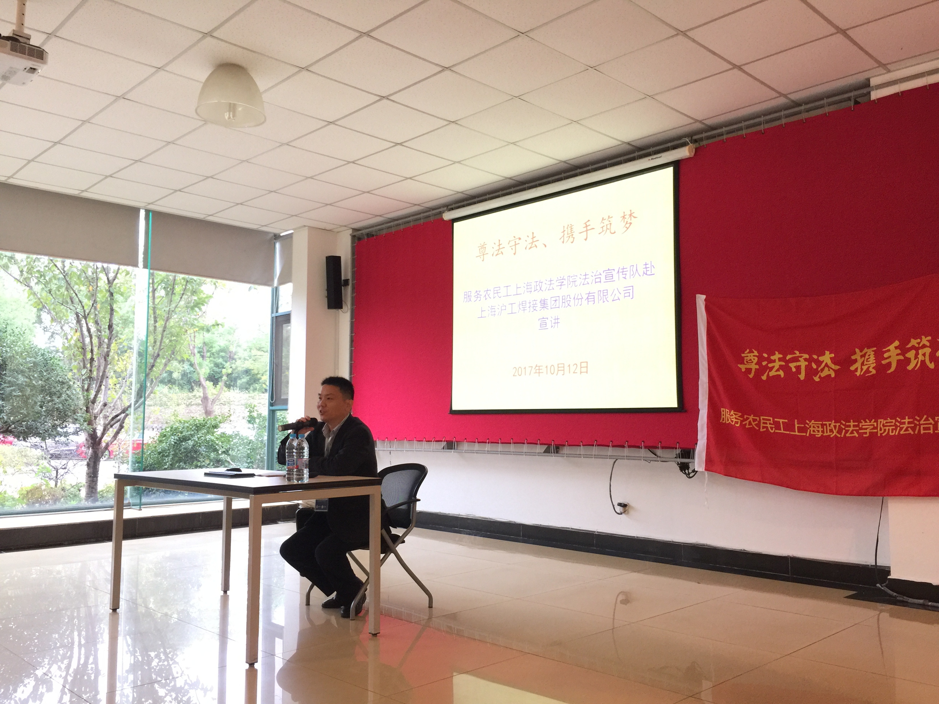 10月12日下午,在青浦总工会的大力支持和安排下,我校服务农民工法治宣传团队赴上海沪工焊接集团股份有限公司开展了第一场法治宣传教育活动。此次活动由青浦总工会丁大庆老师主持,我校刑事司法学院卫老师主讲。