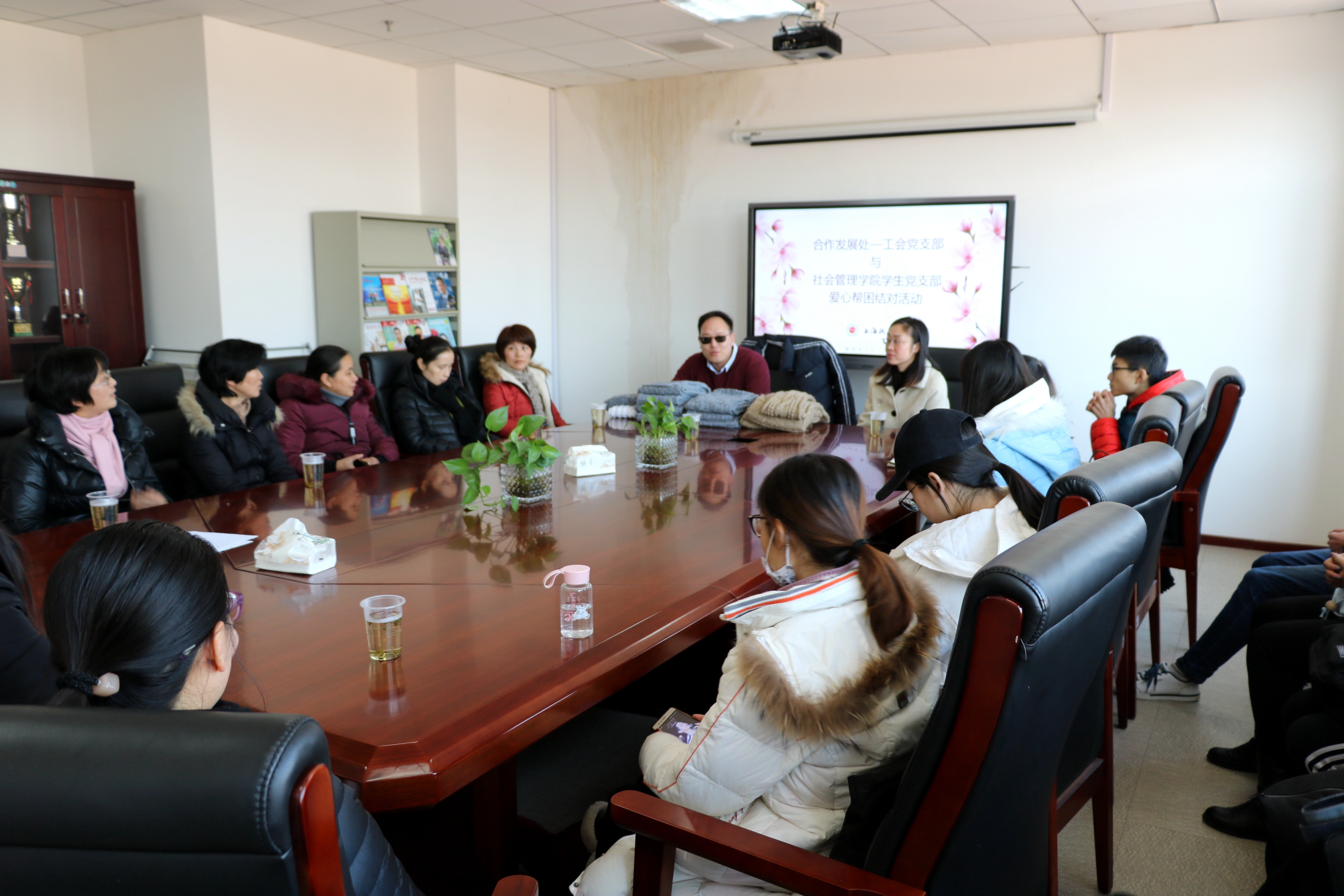 1月10日中午,工会-合作发展处联合党支部与社会管理学院学生党支部在教工活动中心306室开展爱心帮困结对活动。校工会、合作发展处、社会管理学院、校工会女红班教师代表以及部分学生代表出席了活动。