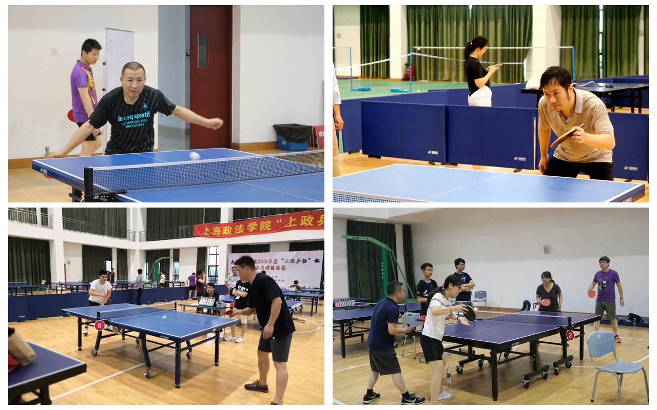 在我校第一次党代会即将召开之际,5月29日下午, 2018年度“上政乒协”杯乒乓球团体赛决赛在我校训练馆火热进行,来自各分工会的老师们积极组队参赛。