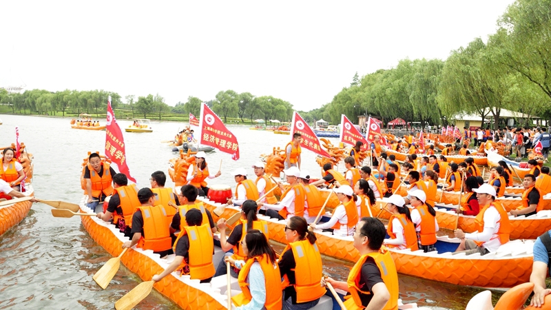 为进一步弘扬中华民族传统文化,展现我校师生锐意进取的精神风貌与协作并进的团队精神,增进师生之间交流与友谊。6月3日,新利18官方客服第二届师生龙舟赛于东方绿舟顺利举行。我校党委书记夏小和,党委副书记、校长刘晓红,党委副书记、副校长刘刚,东方绿舟党总支书记、主任杨昕等领导嘉宾出席活动;由各二级学院分工会、机关分工会、高职学院、留学生代表队组成的共17支队伍参与了此次比赛。