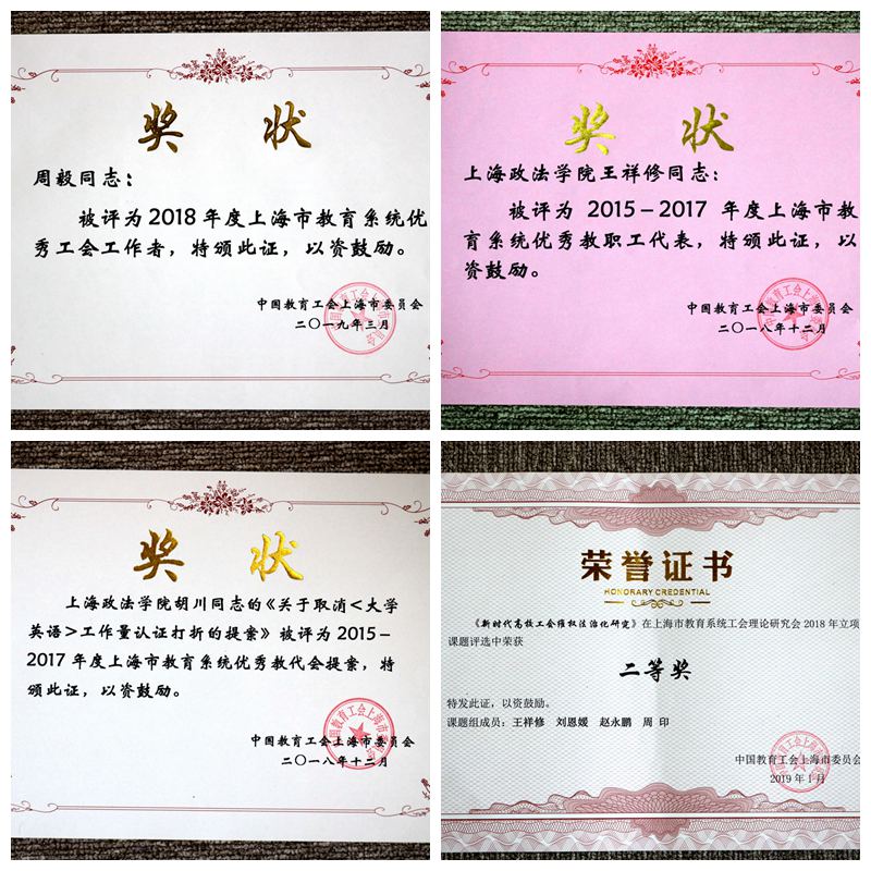 周毅、王祥修同志分别被评为2018年度上海市教育系统优秀工会工作者和2015-2017年度上海市教育系统优秀教职工代表;胡川同志的提案《关于取消<大学英语>工作量认证打折的提案》被评为2015-2017年度上海市教育系统优秀教代会提案;王祥修、刘恩媛、赵永鹏、周印四位老师的《新时代高校工会维权法制化研究》在上海市教育系统工会理论研究会2018年立项课题评选中荣获二等奖。