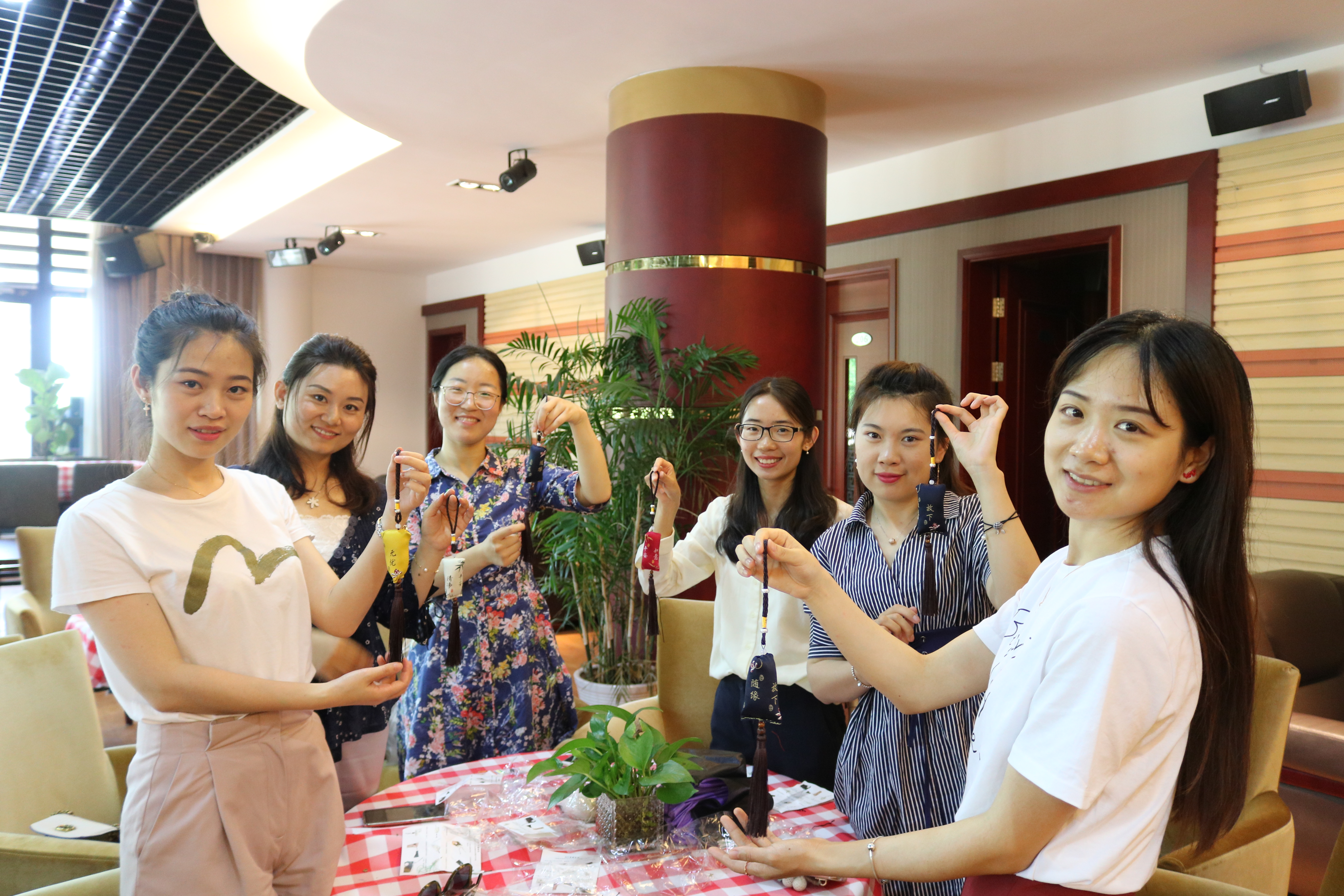 二楼,老师们穿针引线,齐秀女红功底。校工会为大家准备了多种不同寓意的艾草香囊,分别标有“平安喜乐”、“快乐无忧”、“随缘自在”等字样,以寄予最美好的祝愿。活动开始,各位老师纷纷挑选自己喜爱的香囊,随后三五一组,按照步骤指导图纸相互协作。只见针线在老师手中穿梭片刻,一个个小巧精致的艾草香囊就制作完成了。老师们纷纷拿起自己的香囊拍照留念,同时还不忘帮助未完成的老师加快进度,活动现场其乐融融,洋溢着节日的气氛。