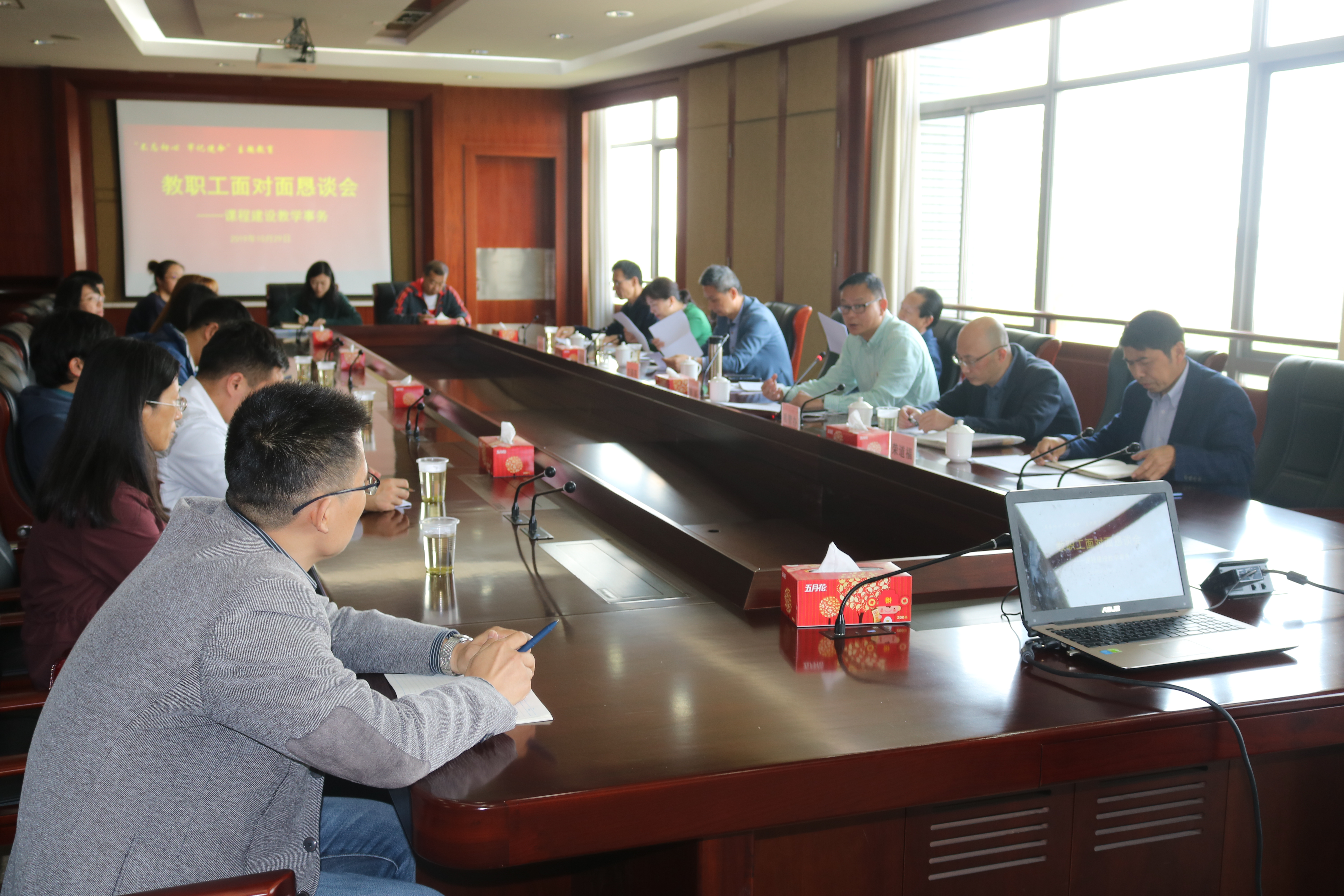 为加大教职工参与学校建设的力度和深度,努力建设一个师生满意度高的和谐校园。10月29日下午,以“课程建设及教学事务”为主题的第二场“不忘初心、牢记使命”主题教育——教职工面对面恳谈会在求实楼413会议室召开。副校长关保英、研究生处处长赵俊、教学质量督查与评估办公室主任李起、教务处副处长陈风光、教务处副处长曾智平、校办副主任荣道福、提案委员会主任王祥修、提案委员会委员、部分提案人及教职工代表出席了本次会议,会议由工会常务副主席周毅主持。