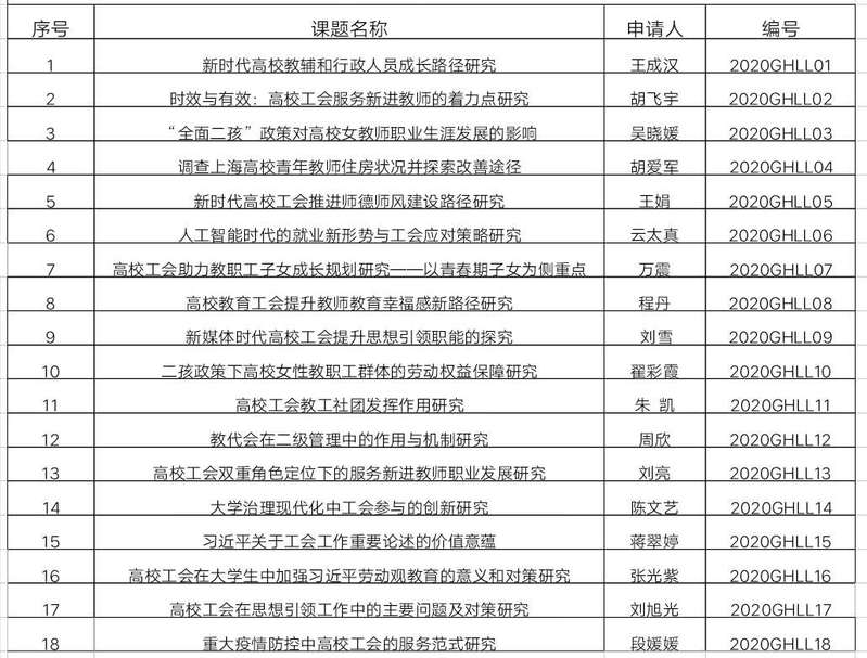 为深入学习贯彻习近平总书记新时代特色社会主义思想,特别是习近平总书记关于工人阶级和工会工作的重要论述以及党的十九大四中全会精神,把全会精神贯彻落实到工会工作全过程、各方面,要深化工会改革,加强职工权益保障,进一步推动新利18官方客服工会工作的理论创新和实践创新,结合中国教育工会上海市委员会《关于开展2020年工会理论研究与调查研究工作的通知》,开展了新利18官方客服2020年工会理论研究与调查研究工作,得到学校教职工积极响应。经专家组评审,申报课题中18项作为校级2020年工会理论研究与调查研究工作立项课题予以支持、培育,研究周期为一年。现将立项课题公布如下:
