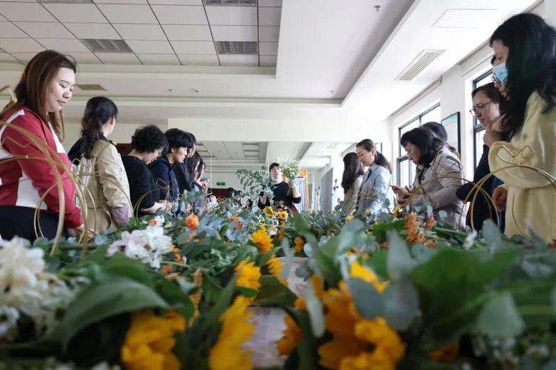 活动现场花香满溢,桌子上摆满了馥郁芳香的各色花材。专业的花艺老师到场为教师们讲授插花技巧知识,重点讲解花卉选择、颜色搭配、花枝修剪等,并进行逐一指导。在老师的指导下,教师们利用不同的花材以及错落的层次,亲手制作了一个个生机盎然的花艺作品,以此作为献礼,为党庆生。最后,大家提着自己精心制作的花艺作品合影留念。