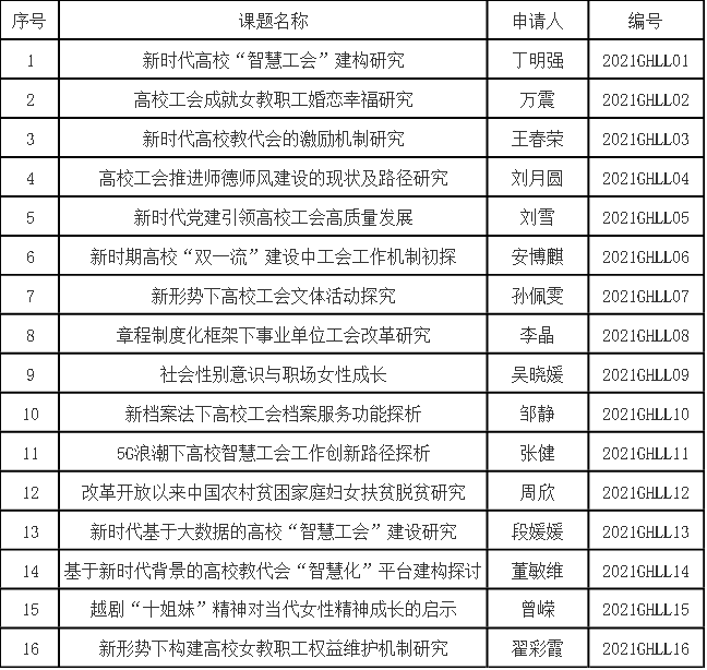 近年来,我校工会深入学习贯彻落实习近平总书记关于工人阶级和工会工作重要论述和习近平总书记在全国劳动模范和先进工作者表彰大会上的重要讲话精神,不断加强工会理论研究工作,连续多年安排理论研究课题,深入推进工会理论研究工作。随着形势进一步发展与工作内容进一步丰富,为进一步加强妇女工作研究,我校工会决定根据上级要求,同步增加妇女理论研究课题。经专家组评审,申报课题中16项作为校级2021年工会理论研究与调查研究工作立项课题予以支持、培育,研究周期为一年。现将立项课题公布如下: