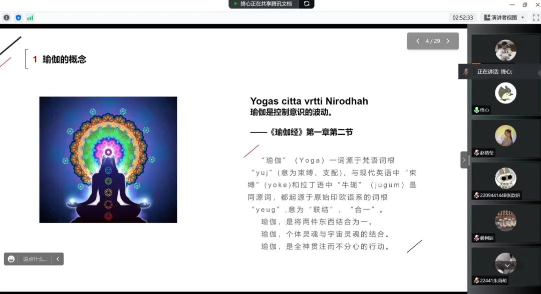 为深入贯彻党的二十大精神,校工会围绕“发展全过程民主,保障职工权利”开展一系列和谐校园文化、彰显人文关怀的活动。12月2日晚,校工会特聘资深瑜伽教练姚秋萍老师在线举办了一场“瑜”悦身心、“伽”人有约——瑜伽理论知识讲座,约200名教职工和学生参加,旨在帮助大家更加科学地进行自我瑜伽练习。