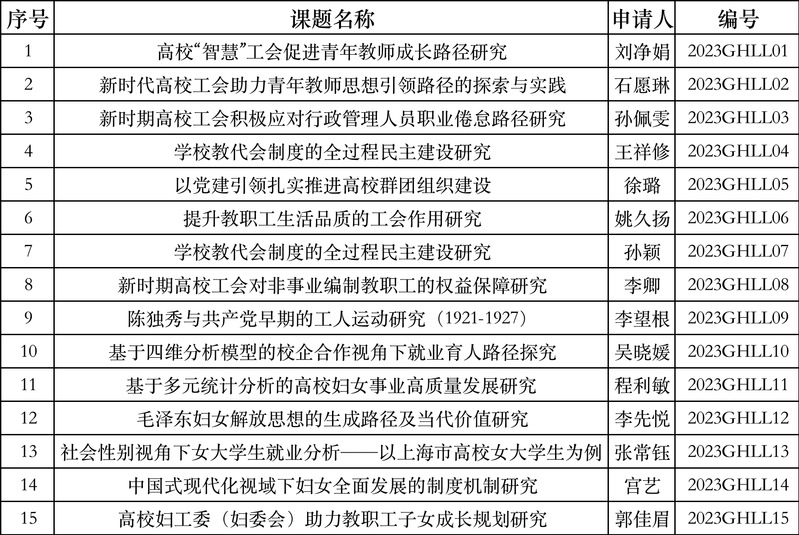 为了深入学习贯彻习近平新时代中国特色社会主义思想,学习贯彻党的二十大精神,以习近平总书记关于工人阶级和工会工作重要论述为指导,不断加强工会理论研究和妇女理论研究工作。根据市教育工会的工作要求,我校工会连续多年安排理论研究课题,坚持开门研究,深入推进工会理论研究和妇女理论研究工作,聚焦教职工急难愁盼问题。经专家组评审,申报课题中15项作为校级2023—2023年度工会理论研究与调查研究(妇女理论研究)工作立项课题予以支持、培育。现将立项课题公布如下: