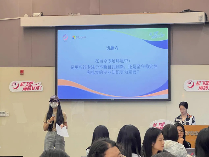 在主题沙龙环节,微软亚太研发集团技术支持工程师杨益、微软亚太研发集团技术支持工程师吴嘉懿、微软亚太研发集团云解决方案架构师袁文弢三名海鸥哥哥和海鸥姐姐们与同学们分享了自己就业道路上的一些经验和做法,如从校园到职场的心路历程和一些面试技巧等,鼓励同学们要勇于探索、多实习、多去尝试自己感兴趣的领域。在随后的“拥抱变化 自我‘刷新’”活动中,小海鸥们以小组讨论形式,与微软公司的代表和海鸥计划的导师进行了深入的交流和探讨,我校小海鸥们积极发表意见,并上台发言。