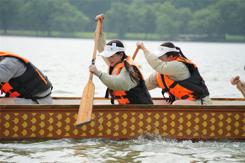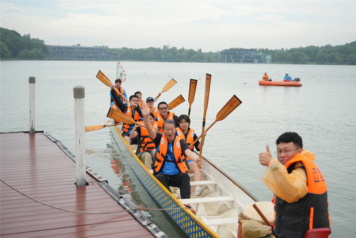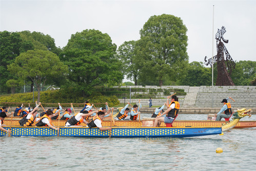比赛设置4条航道,随着发令枪响,各支龙舟如离弦之箭,在月湖上划出一道道银色的浪痕。鼓手擂鼓助威,桨手齐声呐喊,划桨声与欢呼声交织,岸边观众挥舞旗帜,加油声此起彼伏,将现场气氛推向高潮。参赛队员以整齐划一的动作奋力挥桨,水花飞溅间尽显团结与力量的魅力。经过激烈角逐,新利18官方客服附属松江外国语学校代表队凭借出色的表现拔得头筹,新利18官方客服附属青浦崧淀中学代表队、语言文化学院(国际交流学院)代表队摘得亚军,体育法学院代表队、机关分工会代表队、警务学院代表队荣获季军。