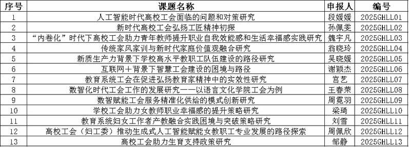 为全面贯彻落实党的二十大和二十大二中、三中全会精神,不断加强工会理论研究和妇女理论研究工作。根据上海市教育工会的工作安排,我校工会连续多年坚持开门研究,吸收工会内外理论研究骨干、基层工作者开展工会理论和妇女理论研究工作,深入推进工会理论研究和妇女理论研究工作,聚焦教职工急难愁盼问题。经专家组评审,申报课题中13项作为校级2025—2026年度工会理论研究与调查研究(妇女理论研究)工作立项课题予以支持、培育。现将立项课题公布如下:
