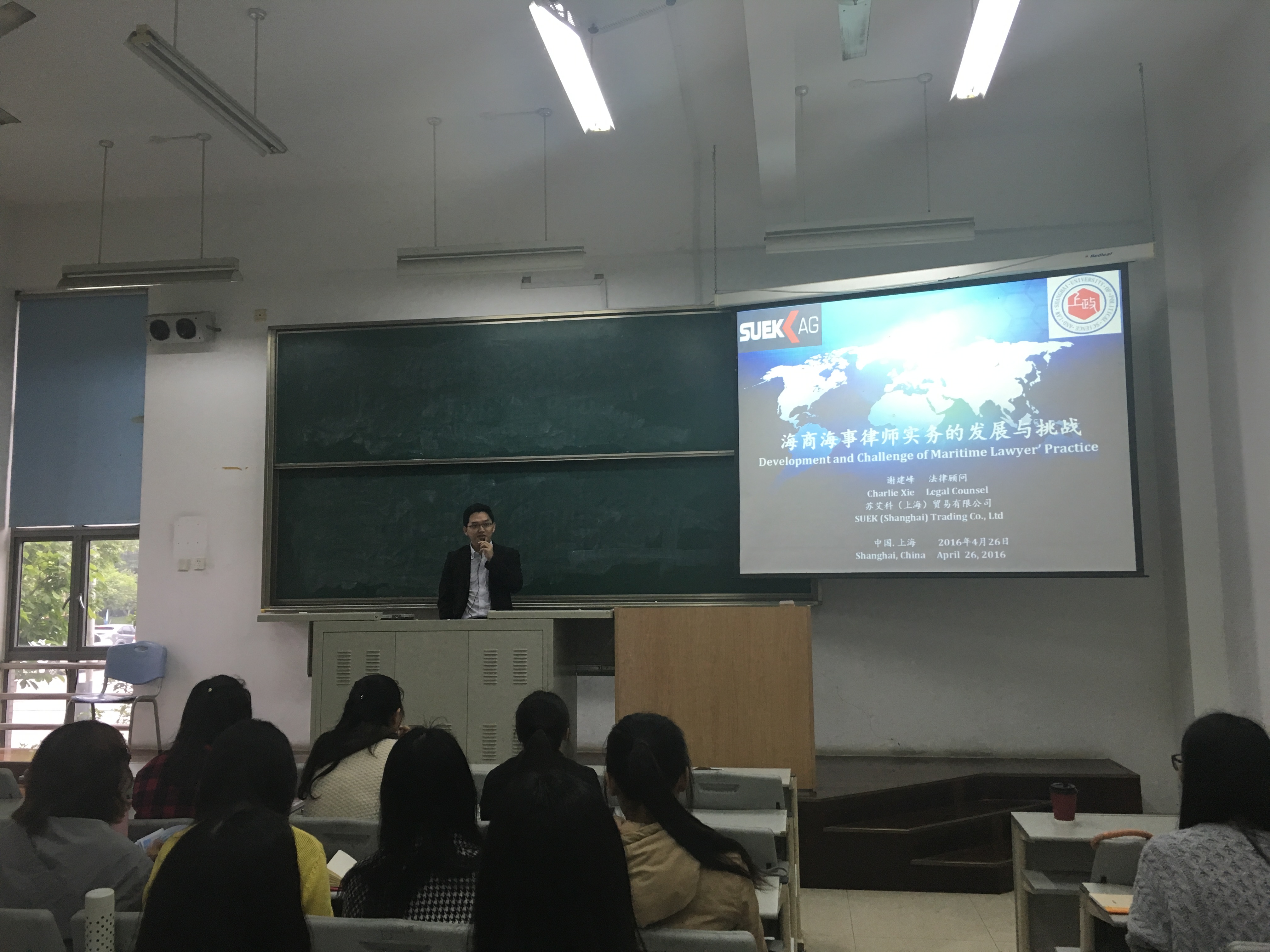 4月26日下午,国际法学院在主教A102举办题为“海商海事律师实务的发展与挑战”的讲座,邀请到SUEK AG苏艾科(上海)贸易有限公司法律顾问、资深海商律师谢建峰先生为学生分享专业背景与律师从业经验,讲座由张正怡博士主持。