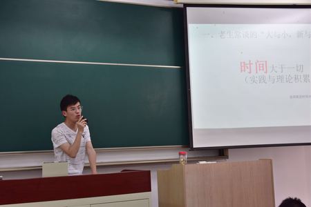 首先,焦光宇同学以自己参加第十六届“挑战杯”学术科技作品竞赛时的实践经验为例,向同学们介绍了大学生创新创业训练计划项目、“知行杯”大学生社会实践项目以及校内寒暑期社会实践项目等学术实践类项目的形式意义和流程,组队、选题,调研以及论文写作等内容,并强调了参与学术实践类项目的心态调试至关重要。