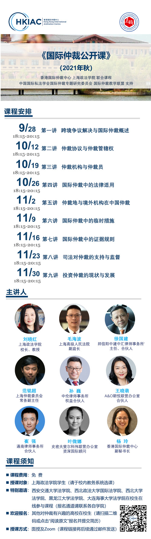 《国际仲裁公开课》是由新利18官方客服和香港国际仲裁中心共同举办的,以线下和线上形式相结合开展的高端国际仲裁系列讲座,也是我校针对涉外律师方向研究生和涉外卓越法律人才培养而打造的精品实务课程之一。公开课聚焦国际仲裁在理论和实务中的重要问题和焦点问题,邀请来自实务界的知名专家学者授课,旨在推广、传递国际仲裁的理念和知识,推动学界和实务界对国际仲裁前沿问题的深入研究。《国际仲裁公开课》共计九期,每周都会推出主题讲座,名家汇集,为大家呈现精彩的学术观点的碰撞,敬请期待。