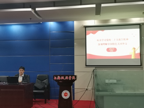 徐炜鑫以“认真学习党的二十大报告精神,深刻理解中国特色大国外交”为题,带领培训班学员逐逐段学习党的二十大报告中有关新时代中国外交方略的重要论述,学习王毅人民日报署名文章《全面推进中国特色大国外交(认真学习宣传贯彻党的二十大精神)》,在其中穿插讲解新时代中国共产党实践中国特色大国外交实例,鼓励学员们关心时政,积极参与到外交实践中去,讲好中国故事,传播中国声音。(撰稿:周楷 摄影:李泽凡)