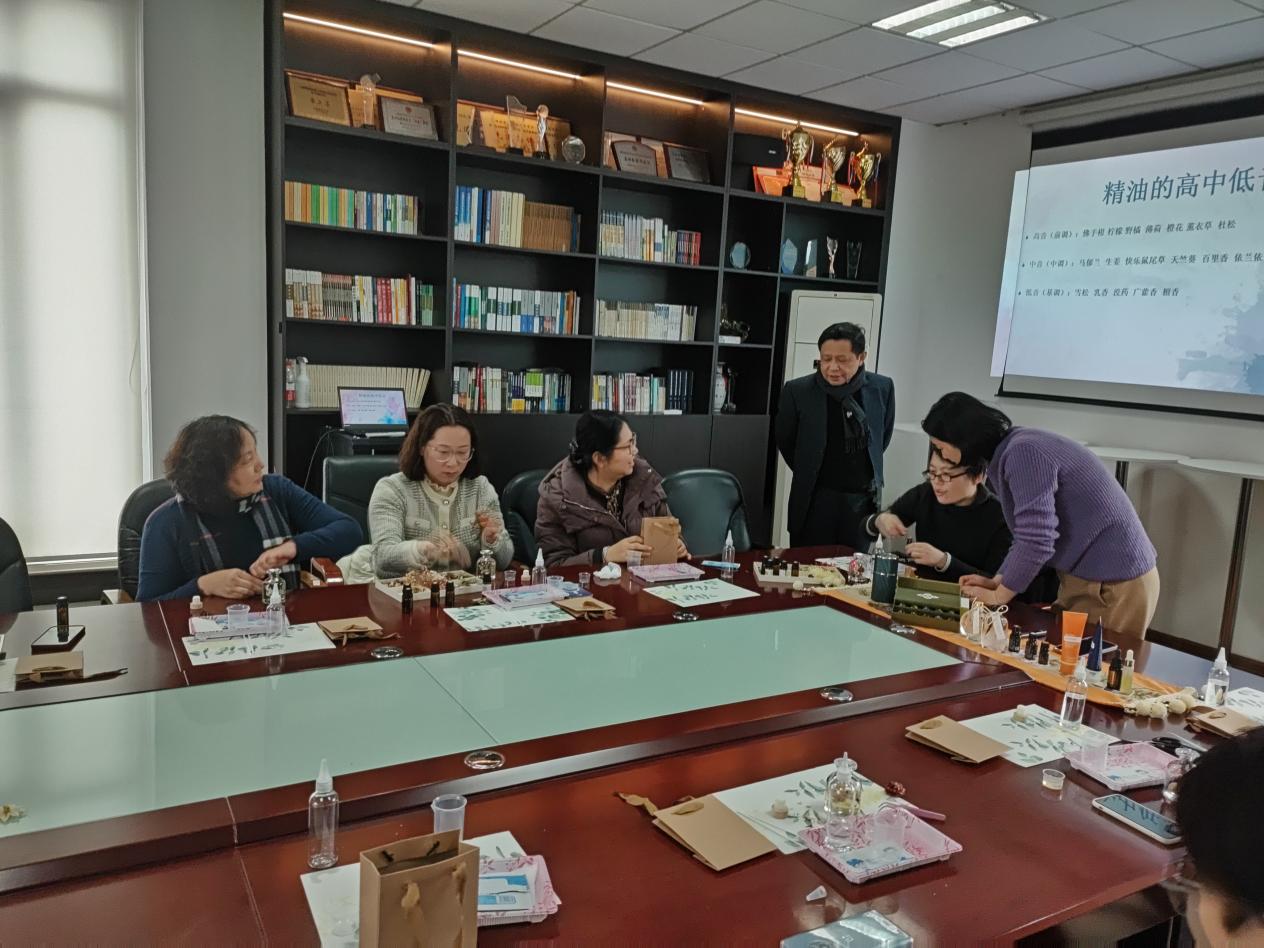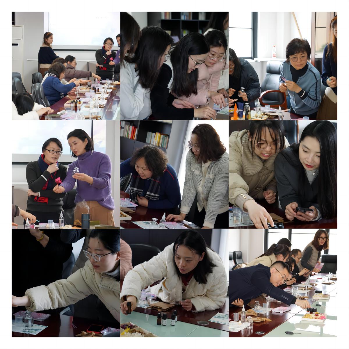 活动现场,培训老师指导老师们使用天然精油放松身心,并为老师们讲解如何搭配调和各种不同香型的香薰制作材料。