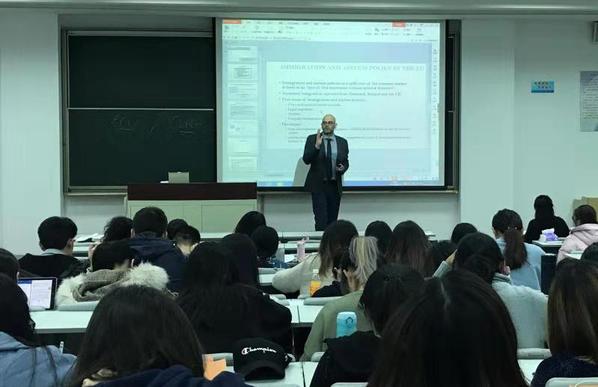 后续讲座以“欧盟移民的管制”为主题,由国际法学院侯幼萍副教授主持。Pablo在讲座伊始与同学们进行了互动,活跃了课堂气氛,随后分析了推动欧盟成员国公民移民的主要原因即经济一体化,移民中的存在的问题包括非正常移民现象,以及欧盟对于移民的立法和司法现状,通过理论与实践相结合的深入浅出的讲述,使听众对欧盟的移民问题有了深入的了解。