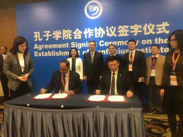 第十三届全球孔子学院大会于12月4至5日在成都举行。国务院副总理、孔子学院总部理事会主席孙春兰出席大会开幕式并致辞。教育部部长、孔子学院总部理事会副主席陈宝生主持大会开幕式。我校与印度金德尔全球大学合作的“汉语言培训与研究中心”项目在大会上举行了签字仪式。我校党委副书记吴强率团出席大会和签字仪式,国际交流处处长、国际交流学院院长欧阳美和,国际交流处王瑶等参加了有关活动。