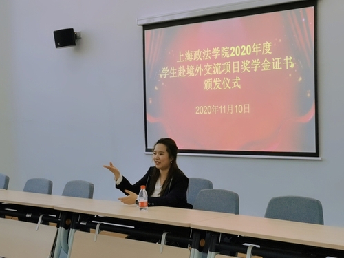 11月10日下午,2020年度学生赴境外交流项目奖学金证书颁发仪式于上合基地103会议室举行。国际交流处学生项目主管刘灵主持本次活动。