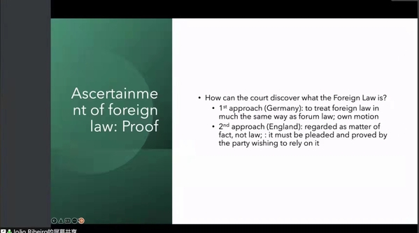 在讲座环节,乔·里贝罗教授详细介绍了法律选择理论、《海牙国际商事合同法律选择原则》的规定以及2022年HCCH对海牙国际商事合同法律选择原则适用情况的最新调查。乔·里贝罗教授从法律选择理论入手,介绍了准据法确定中的“识别”问题以及外国法查明的两种方法以及影响法律选择的防治与公共政策。随后,乔·里贝罗教授介绍了2015年《海牙国际商事合同法律选择原则》的制定过程,并对其中的重点条文进行详细解读。教授介绍了分割法的运用,对比了法律选择中的明示选择与默示选择,并重点讲授了意思自治原则在国际商事合同法律选择中的适用。此外,乔·里贝罗教授还分享了2022年HCCH对海牙国际商事合同法律选择原则适用情况的最新调查,特别分析了部分仲裁机构对海牙国际商事合同法律选择原则的适用情况。
