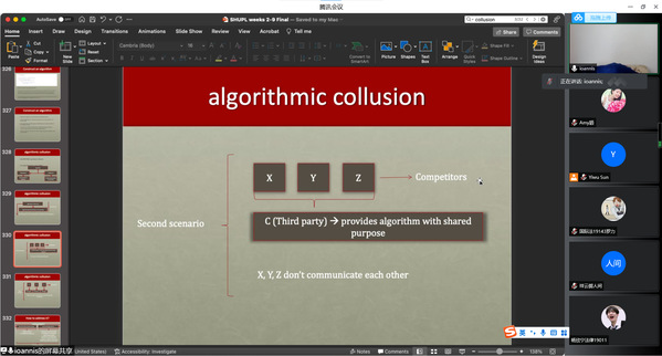 讲座过程中,伊奥尼斯先是向大家介绍了“合谋”(Collusion)的概念,包括关于合谋宽泛的概念、君子协定。他讲到,协调一致的实践需要一些“共识”或“思想的一致”,从而在知情的情况下以合作取代竞争,仅仅巧合的价格上涨不足以证明存在相关的做法以及横向和纵向垄断协议。另外,他给同学们讲解了算法的基本原理、算法合谋的计算方式,还对竞争对手算法合谋的三种情形进行了详细阐释。伊奥尼斯的讲授,也让同学们了解到构造一个简单的价格算法的步骤:第一步是收集过去提供的不同价格点的历史数据以及观察到的需求和要点,第二步是估计需求函数,第三步是解决优化问题,找到使收入或利润等指标最大化的最优价格,并满足定价政策或定价规则施加的约束库存;最后一步就是可以在一定时间段内应用此最优价格,观察已实现的需求,并重复上述过程。