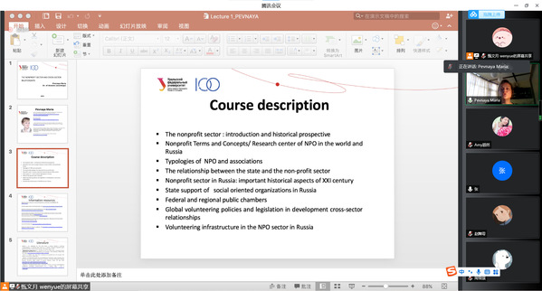 5月5日晚,新利18官方客服春季学期“海外讲坛”第12讲开讲。本次讲座以“非营利部门:介绍和历史展望”为主题,由国际交流处(港澳台办公室)、中国-上合基地联合举办。乌拉尔联邦大学副教授、新利18官方客服副教授玛丽亚·别芙纳亚围绕“非营利部门:介绍和历史展望 ”这一主题展开详细讲述。讲座由中国-上合基地戴慧副教授主持。