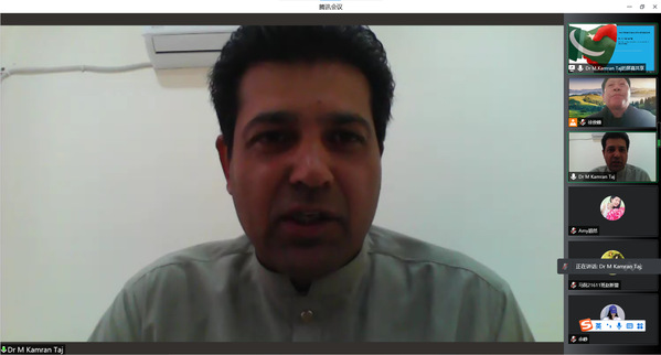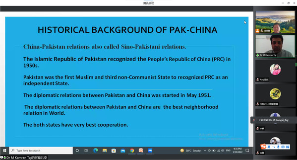 穆罕默德·卡姆兰副教授以时间为主线,将中巴关系划分为六个历史阶段展开讲解,梳理了各个阶段中巴合作的重点领域和推进策略,并重点介绍了中国对巴基斯坦在在反恐与军事,能源和基础设施,贸易和产业、文化交流、抗击疫情等领域的大力援助,以及巴基斯坦在中国的新疆政策,香港国家安全法等方面的鼎力支持。最后他总结,巴基斯坦和中国应加强合作与交流,团结一致打击恐怖主义,深化两国在政治、经济、人文等各方面的合作。