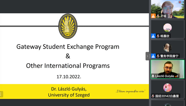 讲座过程中,László Gulyás 博士以“赛格德大学的生活”为主体,围绕该校开展的国际项目展开讲解,详细介绍了赛格德大学的线上和线下的课程计划和安排,赛格德大学丰富有趣的课外活动、学生生活以及能够随时随地交流的国际校友平台。讲座吸引了我校国际法、经济法、刑事司法、警务、法律等学院的学生参加,并与主讲人积极互动提问。作为国际伙伴周“海外讲坛”在线讲座的第二场,活动有助于推进我校同伙伴院校赛格德大学的深入合作,并为我校学生未来留学规划提供了有效的信息和帮助。