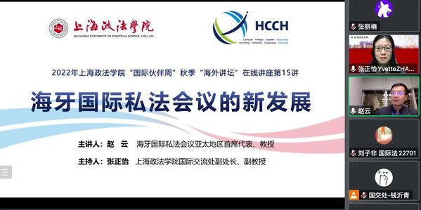 10月27日晚,我校2022年国际伙伴周秋季“海外讲坛”在线讲座第十五讲顺利举办。本次讲座以“海牙国际私法会议的新发展”为主题,主讲人为海牙国际私法会议亚太地区首席代表赵云教授。讲座由国际交流处副处长张正怡主持,我校百余位学生在线聆听。