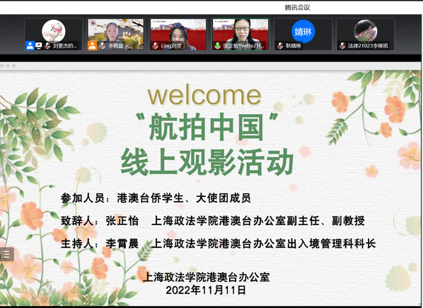 11月11日下午,港澳台办公室举办“航拍中国”上海专题纪录片线上观影活动。我校港澳台侨学生、港澳台办公室工作人员及我校部分大使团成员参加活动。活动由港澳台办公室出入境管理科科长李霄晨主持,港澳台办公室副主任张正怡出席观影活动。