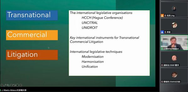 João Ribeiro-Bidaoui教授首先介绍了国际私法研究领域三个重要的国际组织——海牙国际私法会议(HCCH)、联合国国际贸易法委员会(UNICITRAL)、国际统一私法协会(UNIDROIT)。随后对上述国际组织在准据法、管辖及判决的承认与执行方面制定的重要国际法文件进行了详细阐述。João Ribeiro-Bidaoui教授表示在国际私法的协调、统一与现代化过程中,三个国际组织发挥着不同作用。