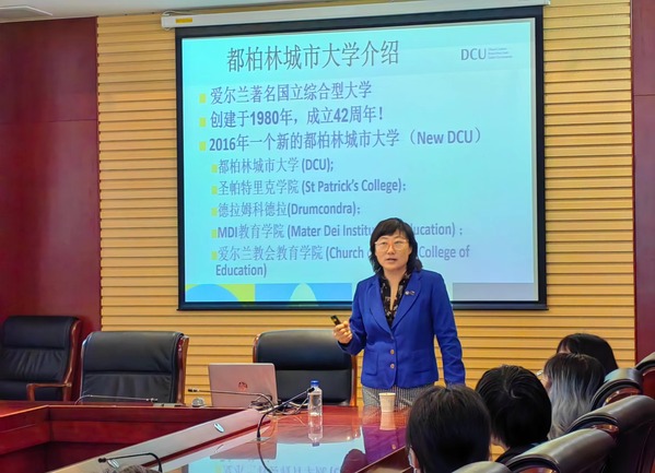 王晓侠介绍了爱尔兰的地理位置、当地风光以及都柏林城市大学的院校背景、校内设施、周边环境等,详细讲解了与我校合作项目所涉及的学科设置、课程概况及学术和英语方面的入学要求细节。