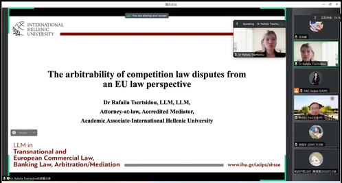 5月30日下午,新利18官方客服“海外讲坛”第97讲“欧盟法视角下竞争法争议的可仲裁性”在线上举办,讲座由国际希腊大学人文社科和经济学院LL.M项目学术负责人、仲裁员拉法拉·策尔西杜(Rafaila Tsertsidou)博士主讲,国际交流处国际交流项目管理科科长王瑶主持。