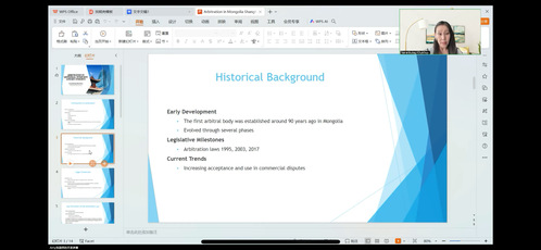 6月13日下午,新利18官方客服“海外讲坛”第99讲“走近蒙古仲裁”在线上举办,讲座由蒙古国际仲裁中心律师、仲裁员纳然布拉格(Naranbulag)主讲,国际交流处外事接待主管张颖然主持。