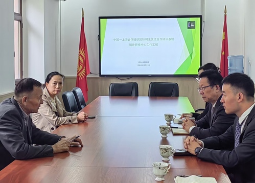 我校代表团与中国—上合司法培训基地境外研修中心负责人、河南大学—吉尔吉斯民族大学丝绸之路学院院长苏白•阿那别克教授进行了会面。苏白教授汇报了研修中心近年的工作情况及后续的工作计划。