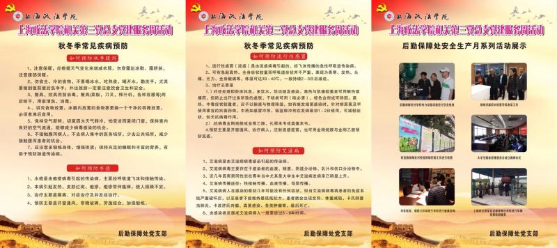 另外,本支部在庸夫楼大厅摆放了后勤保障处安全生产月系列活动的照片展示板,包括胡继灵副校长检查学校食堂工作、后勤保障处对学校电力设备进行安全检查等等。还有宣传秋冬季常见疾病预防的展板,包括秋季腹泻、水痘、流行性感冒、艾滋病等疾病的预防知识。