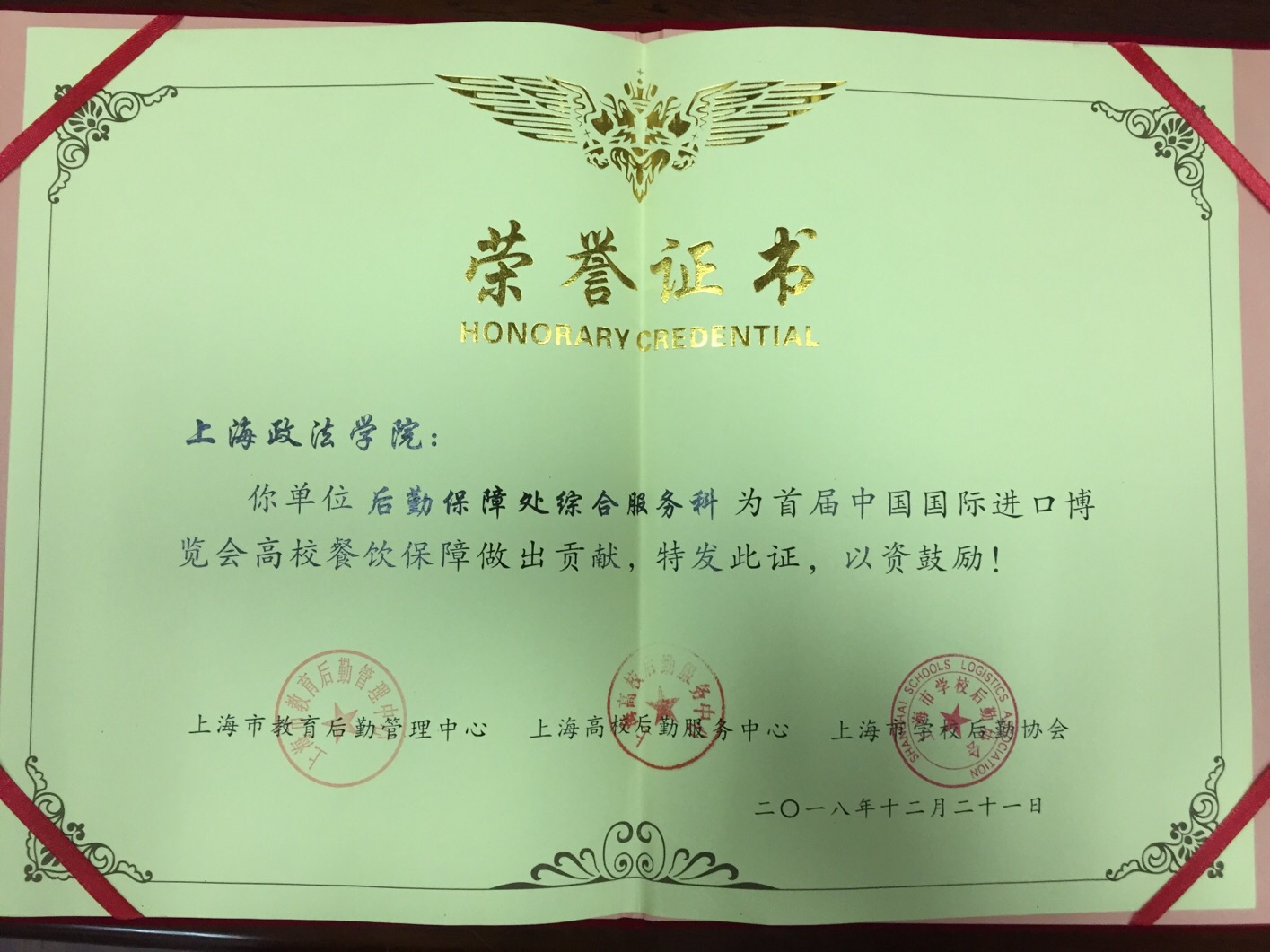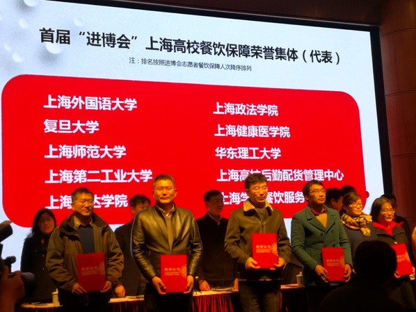 2018年12月21日,上海高校学生餐饮工作会议在华东师范大学召开,会上对首届中国国际进口博览会高校餐饮保障荣誉集体和个人以及2018年度上海高校团体采购先进单位和个人进行了表彰。其中,新利18官方客服后勤保障处综合服务科荣获“首届进博会高校餐饮保障荣誉集体”称号,方志伟、方振虎荣获“首届进博会高校餐饮保障荣誉个人”称号;后勤保障处综合服务科王爱忠荣获2018年度“上海高校后勤团体采购先进个人”称号。